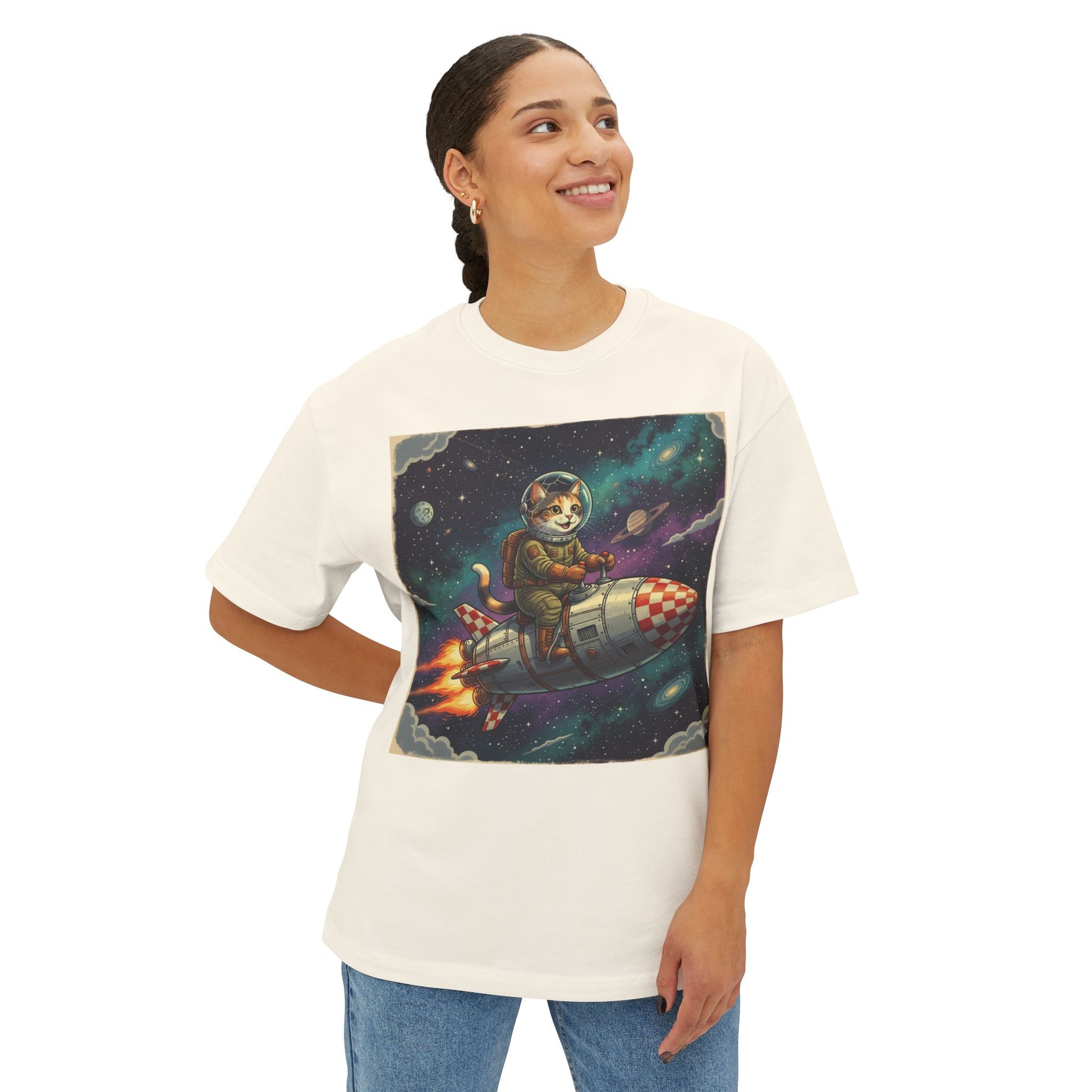 Unisex Oversized Boxy Tee Cat Rocket Outer Space Graphic Tee